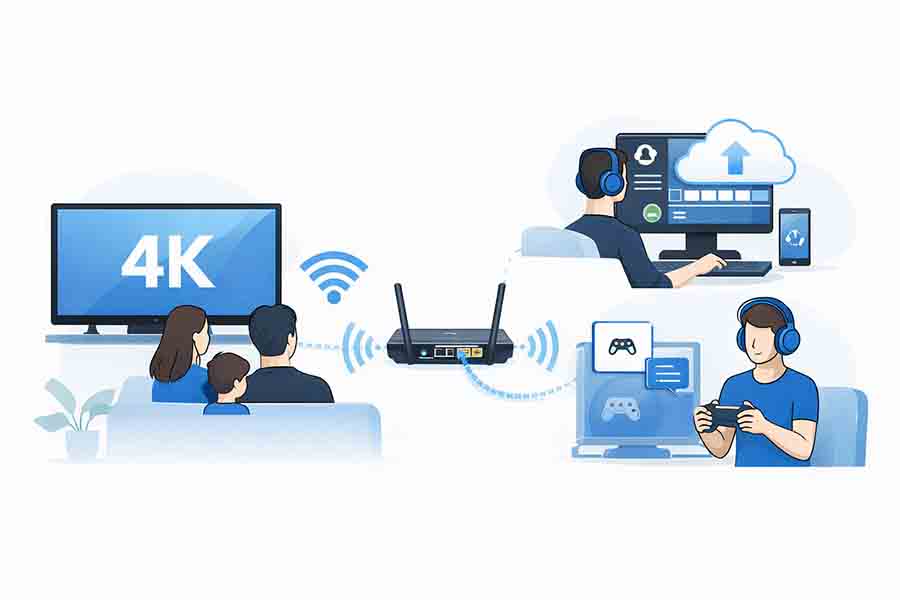 Нагрузка меняется не только по количеству людей, но и по одновременности действий. Если один человек смотрит видео, а второй в это же время выходит на видеозвонок, а телевизор параллельно тянет 4K-контент, интернет начинает ощущаться иначе. В этом смысле нормальная скорость для дома — это скорость с запасом под типичный вечерний сценарий, а не под самый спокойный момент днем.