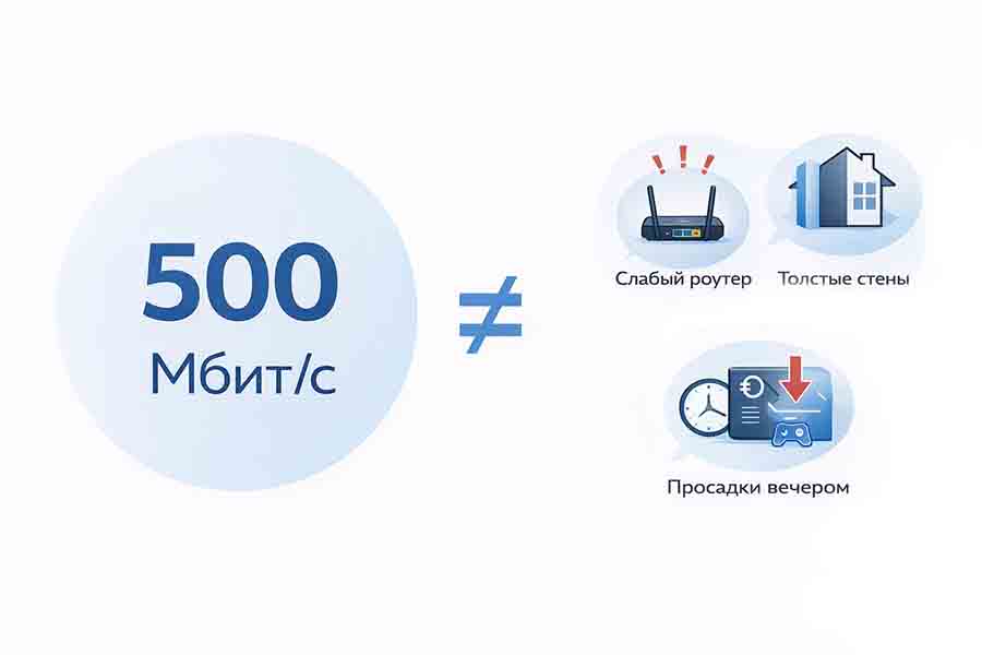 Это один из самых важных выводов темы. Пользователь может подключить 500 Мбит/с и все равно жаловаться на интернет. Причина в том, что часть проблем вообще находится не в тарифе: слабый роутер, неудачное размещение, толстые стены, перегруженный Wi-Fi, нестабильная вечерняя нагрузка по дому или плохая реализация подключения.